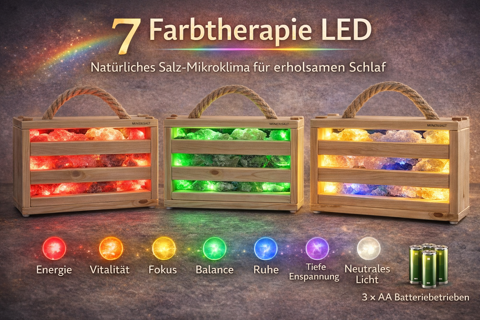 Ervaar ultieme balans en welzijn met de **Minerisalt SaltBox LED** – jouw natuurlijke zuurstofboost én lichttherapie in één! Gevuld met 6 kg oeroud kristalzout en uitgerust met 7 kleuren licht die corresponderen met de chakra’s van je lichaam, brengt deze compacte box rust, energie en harmonie naar elke ruimte.