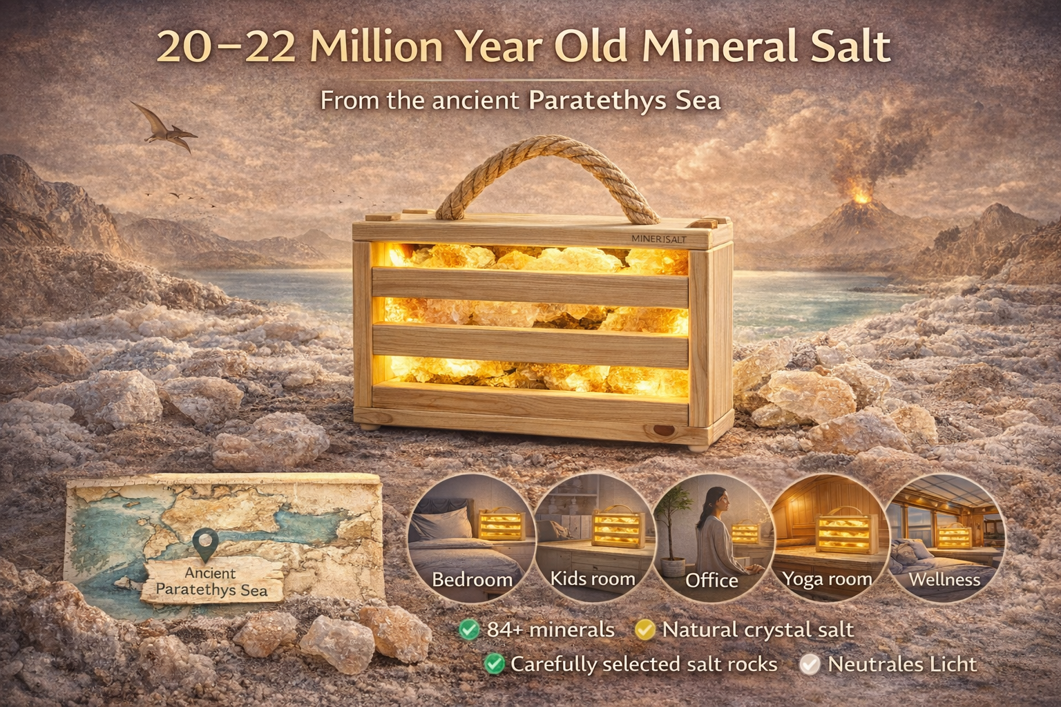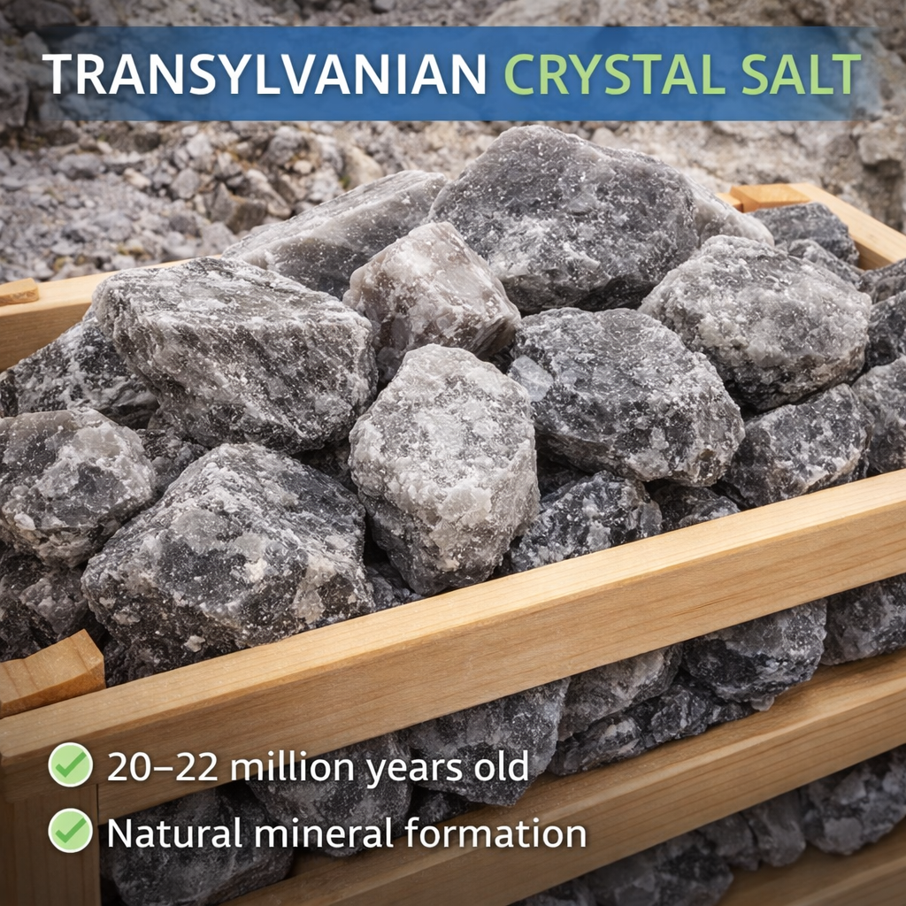 – **6 kg puur Transsylvanisch kristalzout:** Ontstaan uit meer dan 20 miljoen jaar oude zoutafzettingen, rijk aan mineralen die bijdragen aan een frisse, gezonde lucht.
